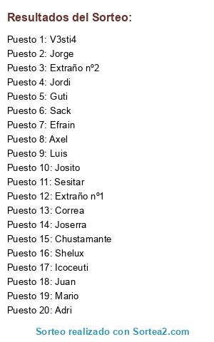 Lista de participantes: Mario, Sack, Guti, V3sti4, Efrain, Sesitar, Correa, Jorge, Jordi, Chustamante, Josito, Adri, Luis, Shelux, Icoceuti, Axel, Joserra, Juan, Extraño nº1, Extraño nº2.