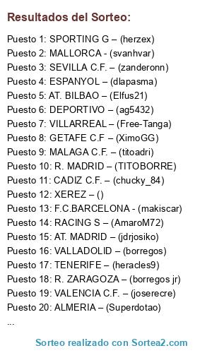 Lista de participantes: VILLARREAL – (Free-Tanga) , SPORTING G – (herzex) , R. ZARAGOZA – (borregos jr) , AT. MADRID – (jdrjosiko) , R. MADRID – (TITOBORRE), F.C.BARCELONA - (makiscar) , TENERIFE – (heracles9) , VALLADOLID – (borregos) , GETAFE C.F – (XimoGG) , AT. BILBAO – (Elfus21) , XEREZ – () , ESPANYOL – (dlapasma) , MALLORCA - (svanhvar) , SEVILLA C.F. – (zanderonn) , OSASUNA – (roberrs777) , DEPORTIVO – (ag5432), VALENCIA C.F. – (joserecre) , MALAGA C.F. – (titoadri) , ALMERIA – (Superdotao) , RACING S – (AmaroM72) , CADIZ C.F. – (chucky_84).