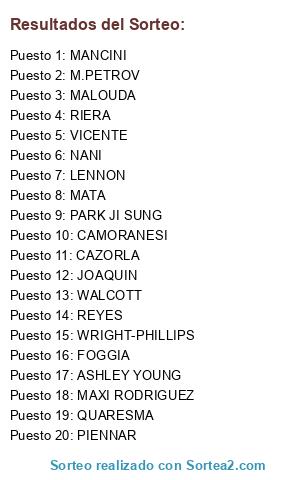 Lista de participantes: ASHLEY YOUNG, RIERA, WRIGHT-PHILLIPS, M.PETROV, PARK JI SUNG, QUARESMA, MANCINI, CAMORANESI, FOGGIA, MAXI RODRIGUEZ, MALOUDA, REYES, JOAQUIN, VICENTE, NANI , CAZORLA, WALCOTT, PIENNAR, MATA, LENNON.