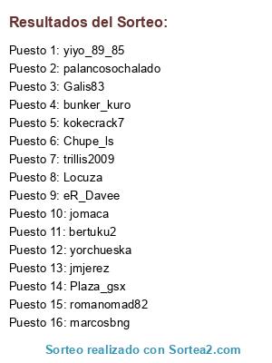 Lista de participantes: bertuku2, bunker_kuro, Chupe_ls, eR_Davee, Galis83, jmjerez, jomaca, kokecrack7, Locuza, marcosbng, palancosochalado, Plaza_gsx, romanomad82, trillis2009, yiyo_89_85, yorchueska.