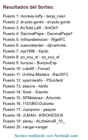 Lista de participantes: sparrowsitn - PScofield, SPMelenas - Arturoito, vangar-vangar, suevoslander - djmarmota, Sixer - Sixerito, AnTokiLLeR - AntOkY, 11DUBO-Dubinho, monkey-luffy - borja_nasri, JLMAN - KIROHESIUS, akacns - kikills, Juanpoon - pespon, abreu - ALzheimeR_10_, cule69 - Frana3, bunyou - BunyouEsp, Uchiha-Madara - RaulSFC, xipi1986 - Xipiiiii, yo_soy_el - yo_soy_el, mithandwesson - RigelFC, el-puto-gordo - el-puto-gordo, DecimalPepe - DecimalPepe7.