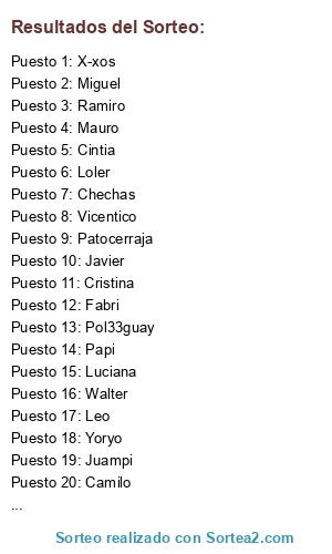 Lista de participantes: Mauro, Plucero, X-xos, Ramiro, Miguel, Juampi, Pol33guay, Camilo, Loler, Leo, Patocerraja, Papi, Fabri, Schumi, Walter, Luciana, Cristina, Cintia, Vicentico, Chechas, Yoryo, Javier.