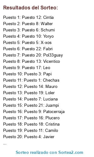 Lista de participantes: Puesto 1: Chechas, Puesto 2: Miguel, Puesto 3: Papi, Puesto 4: Javier, Puesto 5: X-xos, Puesto 6: Schumi, Puesto 7: Luciana, Puesto 8: Walter, Puesto 9: Patocerraja, Puesto 10: Yoryo, Puesto 11: Camilo, Puesto 12: Cintia, Puesto 13: Vicentico, Puesto 14: Mauro, Puesto 15: Ramiro, Puesto 16: Plucero, Puesto 17: Leo, Puesto 18: Cristina, Puesto 19: Loler, Puesto 20: Pol33guay, Puesto 21: Juampi, Puesto 22: Fabri.