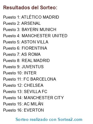 Lista de participantes: REAL MADRID, AC MILÁN, CHELSEA, AS ROMA, MANCHESTER CITY, ARSENAL, FIORENTINA, SEVILLA FC, EVERTON, ATLÉTICO MADRID, INTER, MANCHESTER UNITED, ASTON VILLA, JUVENTUS, FC BARCELONA, BAYERN MUNICH.