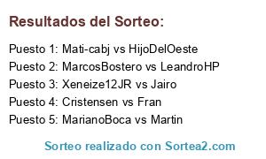 Lista de participantes: MarianoBoca vs Martin, MarcosBostero vs LeandroHP, Mati-cabj vs HijoDelOeste, Cristensen vs Fran, Xeneize12JR vs Jairo.