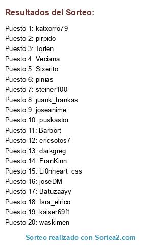 Lista de participantes: Sixerito, kaiser69f1, darkgreg, Isra_elrico, Li0nheart_css, ericsotos7, juank_trankas, pinias, Veciana, joseDM, Torlen, Batuzaayy, Barbort, puskastor, katxorro79, FranKinn, pirpido, joseanime, waskimen, steiner100.