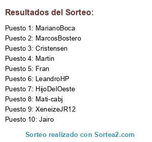 Lista de participantes: LeandroHP, Jairo, Martin, Fran, HijoDelOeste, Mati-cabj, MarianoBoca, MarcosBostero, Cristensen, XeneizeJR12.