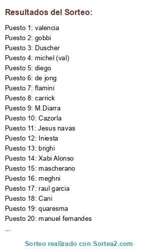Lista de participantes: Valera, M.Rodriguez, P.assuncao, raul garcia, simao, reyes, jurado, camacho, cleber santana, messi, xavi, Y.Toure, Iniesta, Busquets, S.Keita, Marcelo, L.Diarra, Xabi Alonso, Cristiano R., Kaka, guti, granero, van der vaart, M.Diarra, Gago, Drenthe, Jesus navas, Renato, Zokora, Perotti, Duscher, Adriano, Romaric, Lolo, Diego Capel, Albelda, Baraja, Joaquin, Mata, david silva, Vicente, manuel fernandes, jordi alba, michel (val), Banega, Eguren, Senna, Cazorla, Pires, Cani, Ibagaza, walcott, fabregas, song, denilson, eboue, diaby, rosicky, nasri, ramsey, wilshere, essien, malouda, ballack, lampard, kalou, zhirkov, mikel, joe cole, deco, mascherano, lucas, riera, gerrard, benayoun, aquilani, babel, El zhar, spearing, plessis, ireland, de jong, barry, wright-phillips, M.johnson, valencia, fletcher, carrick, nani, park, giggs, scholes, hargreaves, tosic, anderson, gatusso, pirlo, ambrosini, seedorf, flamini, abate, gobbi, zanetti, montolivo, marchionni, donadel, jorgensen, santana, cambiasso, thiago motta, muntari, sneijder, stankovic, mancini, viera, quaresma, krhin, obi, felipe melo, marchisio, sissoko, diego, camoranesi, salihamidzic, tiago, poulsen, giovinco, brocchi, mauri, matuzalem, foggia, dabo, eliseu, ledesma, meghni, de rossi, d. pizarro, taddei, guberti, menez, brighi, perrotta, cerci, ribery.