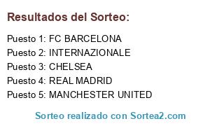 Lista de participantes: FC BARCELONA, REAL MADRID, CHELSEA, MANCHESTER UNITED, INTERNAZIONALE.