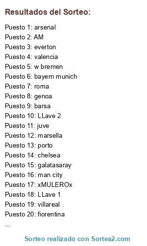 Lista de participantes: RM, barsa, chelsea, man utd, man city, juve, milan, inter, villareal, sevilla, valencia, depor, arsenal, a villa, liverpool, tottenham, lyon, marsella, standard, AM, bayern munich, w bremen, roma, porto, everton, genoa, fiorentina, burdeos, galatasaray, xMULEROx, LLave 1, LLave 2.