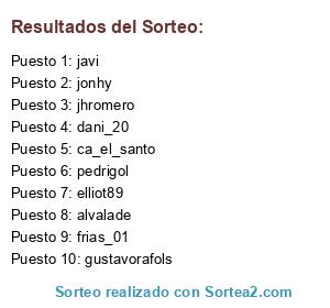 Lista de participantes: javi, elliot89, pedrigol, jhromero, alvalade, gustavorafols, frias_01, jonhy, ca_el_santo, dani_20.
