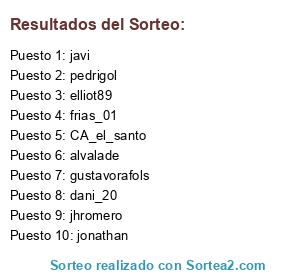 Lista de participantes: javi, elliot89, pedrigol, jhromero, alvalade, gustavorafols, frias_01, jonathan, CA_el_santo, dani_20.