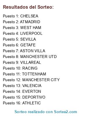 Lista de participantes: GETAFE, LIVERPOOL, WEST HAM, DEPORTIVO, ASTON VILLA, MANCHESTER UTD, MANCHESTER CITY, CHELSEA, EVERTON, TOTTENHAM, RACING, ATHLETIC, ATMADRID, VALENCIA, VILLAREAL, SEVILLA.