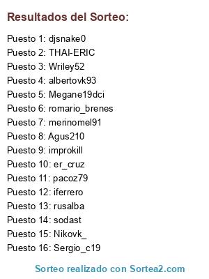 Lista de participantes: THAI-ERIC, albertovk93, Wriley52, Agus210, sodast, iferrero, improkill, pacoz79, er_cruz, Sergio_c19, romario_brenes, Nikovk_, djsnake0, rusalba, Megane19dci, merinomel91.
