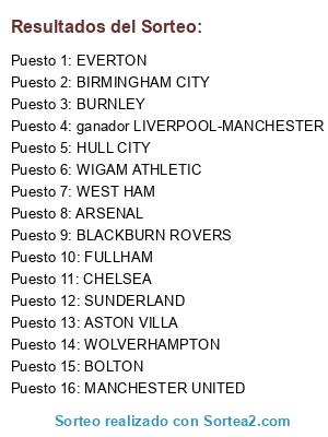 Lista de participantes: ASTON VILLA, ARSENAL, FULLHAM, WEST HAM, BLACKBURN ROVERS, BURNLEY, WIGAM ATHLETIC, CHELSEA, BIRMINGHAM CITY, EVERTON, WOLVERHAMPTON, HULL CITY, SUNDERLAND, BOLTON, MANCHESTER UNITED, ganador LIVERPOOL-MANCHESTER CITY.