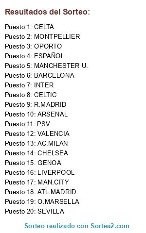 Lista de participantes: MANCHESTER U., LIVORNO, R. MADRID, LIVERPOOL, NAPOLES, O. LYON, CHELSEA, CELTA, OPORTO, VILLARREAL.