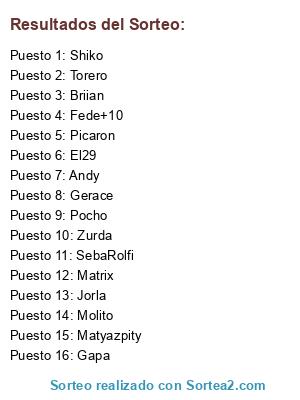 Lista de participantes: Shiko, Gerace, Molito, Gapa, Fede+10, Picaron, SebaRolfi, Andy, Matrix, Jorla, El29, Matyazpity, Zurda, Pocho, Briian, Torero.