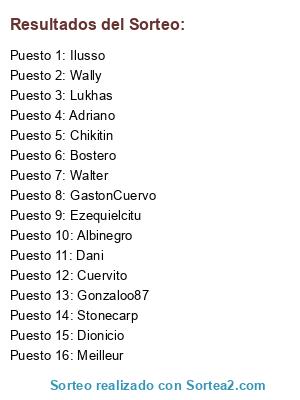 Lista de participantes: Bostero, Wally, Lukhas, Meilleur, Walter, GastonCuervo, Chikitin, Gonzaloo87, Stonecarp, Adriano, Albinegro, Cuervito, Ezequielcitu, Ilusso, Dionicio, Dani.