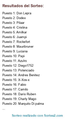 Lista de participantes: Camilo, Luciana, Charly Mago, Papi, Polguay, Walter, Tototes, Andres Benitez, X-Xos-x, Tocamelo, Intercooler, Pilaar, Amilkar, Rusa, Diego, Juampi, Dario Ruben, Leonardo, Marquito Di palma, Cristina, Potenciado, Azulro, Don Lepra, Chueco, Rockefort, Fabio, Dodex, Diego1752, Mauribruner.