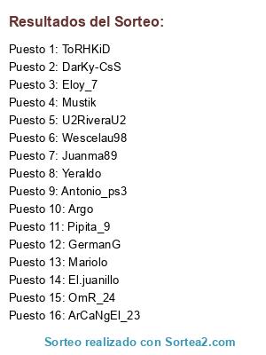 Lista de participantes: ToRHKiD, Mariolo , Eloy_7, Yeraldo , ArCaNgEl_23, DarKy-CsS, Pipita_9, Antonio_ps3, Wescelau98, El.juanillo, Juanma89, Mustik , U2RiveraU2, GermanG, Argo, OmR_24.