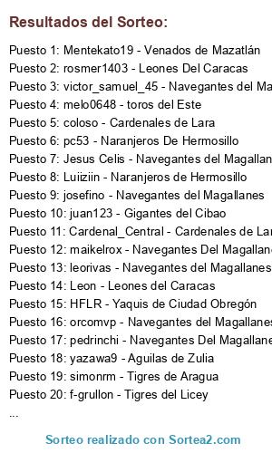 Lista de participantes: pc53 - Naranjeros De Hermosillo, Jesus Celis - Navegantes del Magallanes, Leon - Leones del Caracas, Cardenal_Central - Cardenales de Lara, Rudo14 - Leones Del Caracas, rosmer1403 - Leones Del Caracas, Tito - Leones Del Caracas, fimbres - Naranjeros de Hermosillo, Mentekato19 - Venados de Mazatlán, bermea12 - Mayos de Navojoa, maikelrox - Navegantes Del Magallanes, Luiiziin - Naranjeros de Hermosillo, josefino - Navegantes del Magallanes, venecojr - Tiburones De La Guaira, HFLR - Yaquis de Ciudad Obregón, jose11722 - Tigres del Licey, coloso - Cardenales de Lara, yazawa9 - Aguilas de Zulia, simonrm - Tigres de Aragua, yacenis - Aguilas de Zulia, orcomvp - Navegantes del Magallanes, f-grullon - Tigres del Licey, chowe - Navegantes del Magallanes, rayko - Aguilas de Zulia, juniormvp - Venados de Mazatlan, melo0648 - toros del Este, leorivas - Navegantes del Magallanes, pedrinchi - Navegantes Del Magallanes, victor_samuel_45 - Navegantes del Magallanes, juan123 - Gigantes del Cibao, luispetrucci - Navegantes del Magallanes, Araguax - Tigres de Aragua.