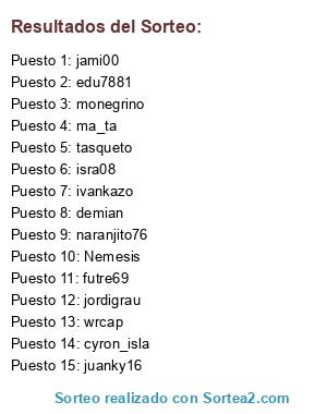 Lista de participantes: Nemesis, cyron_isla, isra08 , monegrino, ivankazo, futre69, jordigrau, tasqueto, naranjito76, demian, jami00, edu7881, wrcap, ma_ta, juanky16.