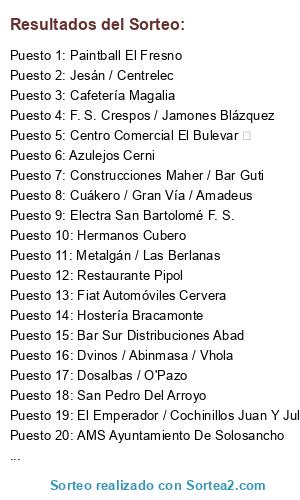 Lista de participantes: Sport Factory, Hostería Bracamonte, Electra San Bartolomé F. S. , Bar Sur Distribuciones Abad, Jamones Blázquez Crespos , San Pedro Del Arroyo, Sugux Bar De Copas, R. Yuste S. A., Restaurante Luisi / Villacastín F. S. , Bar Prisma, General Óptica, Imprenta Castilla Oh Publicidad, Fiat Automóviles Cervera, Aluminios Pindado / Cristalería Margón, Dolce Vita, Padecasa / Bar Talento, Volvo Eurocatursa / Árricas Express, La Villa F. S., Santander Consumer / Chuladas, Asesoría Sánchez / Flores Y Jiménez, Taller Mecánico Fernando Hernández, Cafetería Plaza De Zurraquín , El Emperador / Cochinillos Juan Y Julio, El Porvenir / Alpo Moda / Martiherrero, Arte Y Café 36 / Las Cancelas / Kedada, Metalgán / Las Berlanas, A. R. Del Río / D. Alfonso / cincosombreros, Jesán / Centrelec, Degramar / Bar Sindical Mingorría, Bar San Antonio / Punto Cero , Granite Balls, La Bodega De Juan / Bar El Moro, Babel / Cochinillos Alfredo Y Luis, Bar Los Llanos, Muñana F. S., Hermanos Cubero, Azulejos Cerni, Sotolux / El Arco / La Corneja / C. Marisa, Básico Bar De Copas, Taberna Templarios / Censenal Servicios, Carbuávila / Pacopesca, Bar La Vereda / Cafetería Los Jerónimos, Promoávila, Centro Comercial El Bulevar , Elgorriaga, Almacenes La Muralla / Padicar, Dosalbas / O'Pazo, Nueveoncecars.com / Alimentación Marina, Zurich Ávila / Autoescuela Collado, La Herrería / La Bodega de Juan, F. S. Crespos / Jamones Blázquez, Pórticorural.com ReservasDeTurismo.com, Deportes Alfonso / Dolce Vita o Bar San Antonio / El Estanquito, AMS Ayuntamiento De Solosancho, Paintball El Fresno, Bar Casablanca / Peluquería Énfasis, Tornadizos De Ávila, Cafetería Magalia, Restaurante Pipol, Mecafrío / Niharra, Bar Paraíso / Federóptico Cuadrado, Construcciones Maher / Bar Guti, Cuákero / Gran Vía / Amadeus, Dvinos / Abinmasa / Vhola.