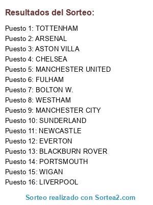 Lista de participantes: BLACKBURN ROVER, TOTTENHAM, BOLTON W., WESTHAM, ARSENAL, EVERTON, FULHAM, SUNDERLAND, PORTSMOUTH, ASTON VILLA, NEWCASTLE, MANCHESTER CITY, CHELSEA, MANCHESTER UNITED, WIGAN, LIVERPOOL.