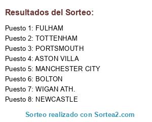 Lista de participantes: TOTTENHAM, ASTON VILLA, FULHAM, BOLTON, MANCHESTER CITY, NEWCASTLE, PORTSMOUTH, WIGAN ATH..