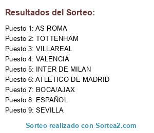 Lista de participantes: VILLAREAL, TOTTENHAM, ESPAÑOL, ATLETICO DE MADRID, VALENCIA, INTER DE MILAN, SEVILLA, AS ROMA, BOCA/AJAX.
