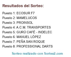 Lista de participantes: A.C.M. TRANSPORTES, PEÑA SAN ROQUE, MAMELUCOS, GURÚ CAFÉ - INDELEC, MANUEL LÓPEZ, PROFESSIONAL DARTS, PROINSOL, ECOSUR F7.