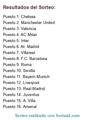 Lista de participantes: F.C. Barcelona, Real Madrid, Manchester United, Liverpool, Chelsea, Arsenal, AC Milan, Inter, Juventus, Bayern Munich, Valencia, At. Madrid, Villareal, Sevilla, A. Villa, Roma.