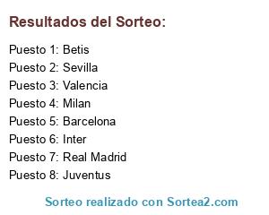 Lista de participantes: Barcelona, Real Madrid, Valencia, Sevilla, Betis, Juventus, Inter, Milan.
