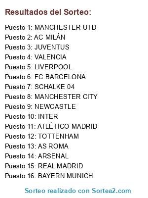 Lista de participantes: LIVERPOOL, AC MILÁN, REAL MADRID, NEWCASTLE, SCHALKE 04, TOTTENHAM, FC BARCELONA, ATLÉTICO MADRID, INTER, JUVENTUS, MANCHESTER UTD, AS ROMA, MANCHESTER CITY, BAYERN MUNICH, VALENCIA, ARSENAL.