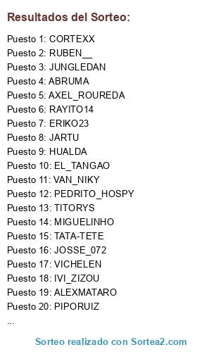 Lista de participantes: ERIKO23, CORTEXX, IVI_ZIZOU, MIGUELINHO, HUALDA, XEXU23, TITORYS, VAN_NIKY, TONY_LARREY, FRANCIS, RUBEN__, KIKILL0, PRO_KILLER_CR7, PEDRITO_HOSPY, ALEXMATARO, EL_GUAJE7, ABRUMA, AXEL_ROUREDA, RAYITO14, ERIK17, ERIKCIN3, DEMI77, JARTU, XEREMATADOR, FORTOPETA, EL_TANGAO, JOSITOXVII, JOSSE_072, TATA-TETE, VICHELEN, PIPORUIZ, JUNGLEDAN.