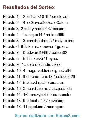 Lista de participantes: 1 cacique14 / mi kun999 , 2 voleymaster10/resisent, 3 huachalomo / jacques lda, 4 mago valdivia / ignacio86, 5 blacktapia3 / xirac uc, 6 el fenomeno19 / colocoio26, 7 alexo cl / androlaxxx, 8 flako max power / gox rx, 9 jefexile117 / kazeking, 10 edward1986 / balrog92, 11 pipekine / monogorn, 12 sirfrank1978 / xrodx xcl, 13 pancho dance / maykelone, 14 xxGayox360xx / Calota, 15 Enrikoski / Leynoz, 16 i crazyb0t / fr darksnake.
