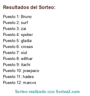 Lista de participantes: Bruno, gladia, croxas , siul, zai , spolier, hades, wilthar , josepaco, surf , marcvs , itachi.
