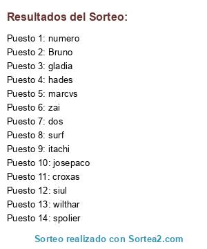Lista de participantes: Bruno, gladia, croxas , siul, zai , spolier, hades, wilthar , josepaco, surf , marcvs , itachi, numero , dos.