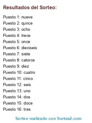 Lista de participantes: uno , dos, tres, cuatro, cinco, seis, siete, ocho, nueve, diez, once, doce, trece, catorce, qunce, dieciseis.