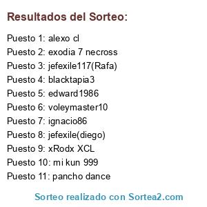 Lista de participantes: jefexile(diego) , blacktapia3 , pancho dance , voleymaster10 , ignacio86 , edward1986 , jefexile117(Rafa), alexo cl , xRodx XCL , mi kun 999 , exodia 7 necross.