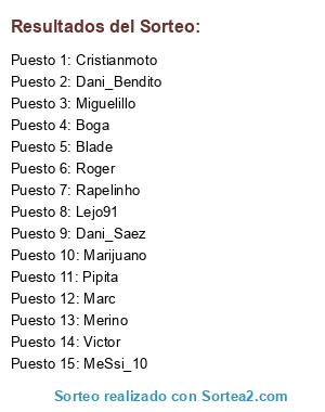 Lista de participantes: Lejo91, Marc, Dani_Bendito, MeSsi_10, Dani_Saez, Boga, Cristianmoto, Blade, Victor, Merino, Pipita , Miguelillo, Rapelinho, Roger, Marijuano.
