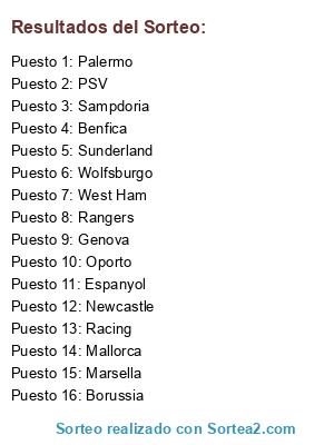 Lista de participantes: Genova, Sunderland, Borussia, West Ham, Rangers, Espanyol, Palermo, PSV, Mallorca, Sampdoria, Wolfsburgo, Newcastle, Marsella, Racing, Oporto, Benfica.