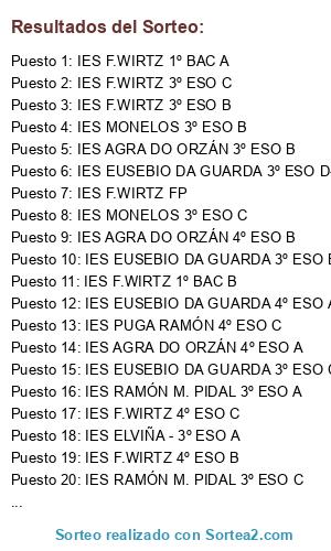 Lista de participantes: IES ELVIÑA - 3º ESO A , IES ELVIÑA - 3º ESO B , IES F.WIRTZ 3º ESO A , IES F.WIRTZ 3º ESO B, IES F.WIRTZ 3º ESO C , IES F.WIRTZ 4º ESO A , IES F.WIRTZ 4º ESO B, IES F.WIRTZ 4º ESO C, IES F.WIRTZ FP , IES F.WIRTZ 1º BAC A , IES F.WIRTZ 1º BAC B , IES F.WIRTZ 1º BAC C , IES PUGA RAMÓN 4º ESO C, IES EUSEBIO DA GUARDA 3º ESO A , IES EUSEBIO DA GUARDA 3º ESO B, IES EUSEBIO DA GUARDA 3º ESO C , IES EUSEBIO DA GUARDA 3º ESO D-V, IES EUSEBIO DA GUARDA 4º ESO A, IES EUSEBIO DA GUARDA 4º ESO B, IES AGRA DO ORZÁN 3º ESO A , IES AGRA DO ORZÁN 3º ESO B, IES AGRA DO ORZÁN 3º ESO C, IES AGRA DO ORZÁN 4º ESO A , IES AGRA DO ORZÁN 4º ESO B, IES RAMÓN M. PIDAL 3º ESO A, IES RAMÓN M. PIDAL 3º ESO B, IES RAMÓN M. PIDAL 3º ESO C, IES RAMÓN M. PIDAL 3º ESO D, IES RAMÓN M. PIDAL 4º ESO A, IES MONELOS 3º ESO A , IES MONELOS 3º ESO B , IES MONELOS 3º ESO C.