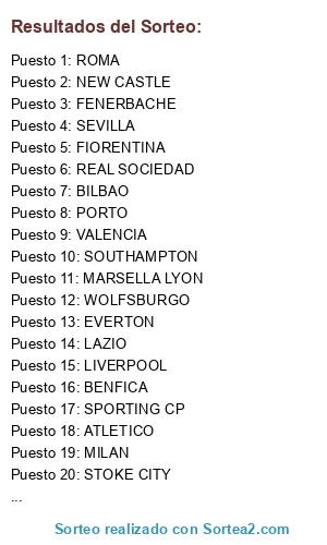 Lista de participantes: ATLETICO, LEVERKUSEN, B. MGLADBACH, SHALKE04, WOLFSBURGO, MONACO, MARSELLA LYON, BILBAO, REAL SOCIEDAD, SEVILLA, VALENCIA, VILLAREAL, EVERTON, LIVERPOOL, NEW CASTLE, SOUTHAMPTON, SPURS, STOKE CITY, SWANSEA CITY, MILAN, FIORENTINA, INTER, LAZIO, NAPOLI, ROMA, PORTO, BENFICA, SPORTING CP, SHAKTAR, ZENIT, FENERBACHE, BESIKTAS.