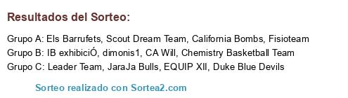 Lista de participantes: CA Will, Chemistry Basketball Team, IB exhibiciÓ, California Bombs, Duke Blue Devils, dimonis1, Scout Dream Team, Leader Team, Els Barrufets, Fisioteam, JaraJa Bulls, EQUIP XII.