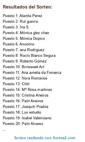 Lista de participantes: Patri Aneiros(5 participaciones), Mónica Dopico(5 participaciones), Joaquín Prados(5 participaciones), Rut guerra(5 participaciones), Cristina Aneiros(5 participaciones), Rocío Blanco Segura(2 participaciones), Roberto Gómez(5 participaciones), ana Rodriguez(5 participaciones), Bcnsweet Art(5 participaciones), Iria S.(5 participaciones), Isabel Valenciano(2 participaciones), Mónica glez chao(3 participaciones), Esther Val(3 participaciones), Patri Alvarez(2 participaciones), Chiti(5 participaciones), Mª Rosa martinez(5 participaciones), Lux estudio, Liova Sánchez(3 participaciones), Nora Romanos(2 participaciones), Ana amelia da Fonseca(2 participaciones), Alanita Perez (5 participaciones), Anonimo(25 participaciones).