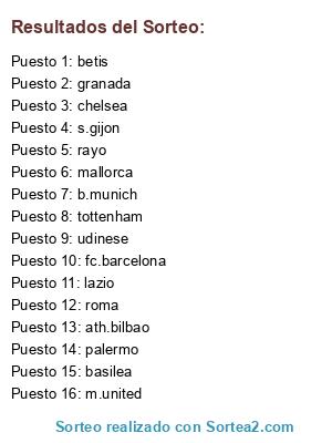 Lista de participantes: granada, roma, palermo, ath.bilbao, tottenham, udinese, basilea, lazio, b.munich, fc.barcelona, betis, rayo, s.gijon, mallorca, chelsea, m.united.