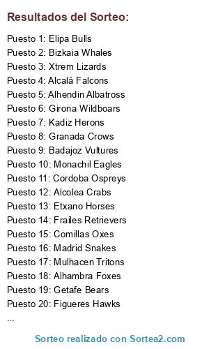 Lista de participantes: Alcolea Crabs, Alhambra Foxes, Alhendin Albatross, Badajoz Vultures, Barna Owls, Bizkaia Whales, Frailes Retrievers, Comillas Oxes, Cordoba Ospreys, Elipa Bulls, Etxano Horses, Figueres Hawks, Getafe Bears, Girona Wildboars, Granada Crows, Manresa Magpies, Elizondo Deers, Kadiz Herons, Xixon Spiders, Madrid Snakes, Monachil Eagles, Mulhacen Tritons, Palamos Sparrows, Parla Lynx, Alcalá Falcons, Sestao Latxas, Toledo Wolves, Vicar Bees, Xtrem Lizards, San Fernando Octopus.