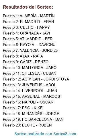 Lista de participantes: AC MILÁN - JORDI STOYA, AJAX - RAFA, ALMERÍA - MARTÍN, ARSENAL - MARCOS, AT. MADRID - FER, CELTIC - HAPPY, CHELSEA - CUBAN, CÁDIZ - RENZO, ELCHE - RUBÉN, FC BARCELONA - DANI, GRANADA - JAVI, JUVENTUS - ADOL, LIVERPOOL - JUAN, MIRANDÉS - JORGE, NAPOLI - OSCAR, PSG - KIKE, R. MADRID - FRAN, RAYO V. - DAVICHU, MALLORCA - JABO, VALENCIA - JORDI25.