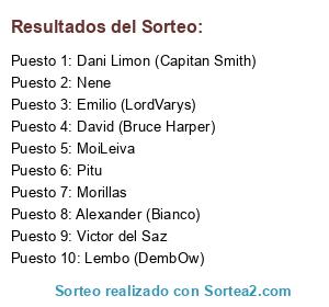 Lista de participantes: Lembo (DembOw), Dani Limon (Capitan Smith), Alexander (Bianco), Pitu, MoiLeiva, Victor del Saz, Emilio (LordVarys), Morillas, David (Bruce Harper), Nene.